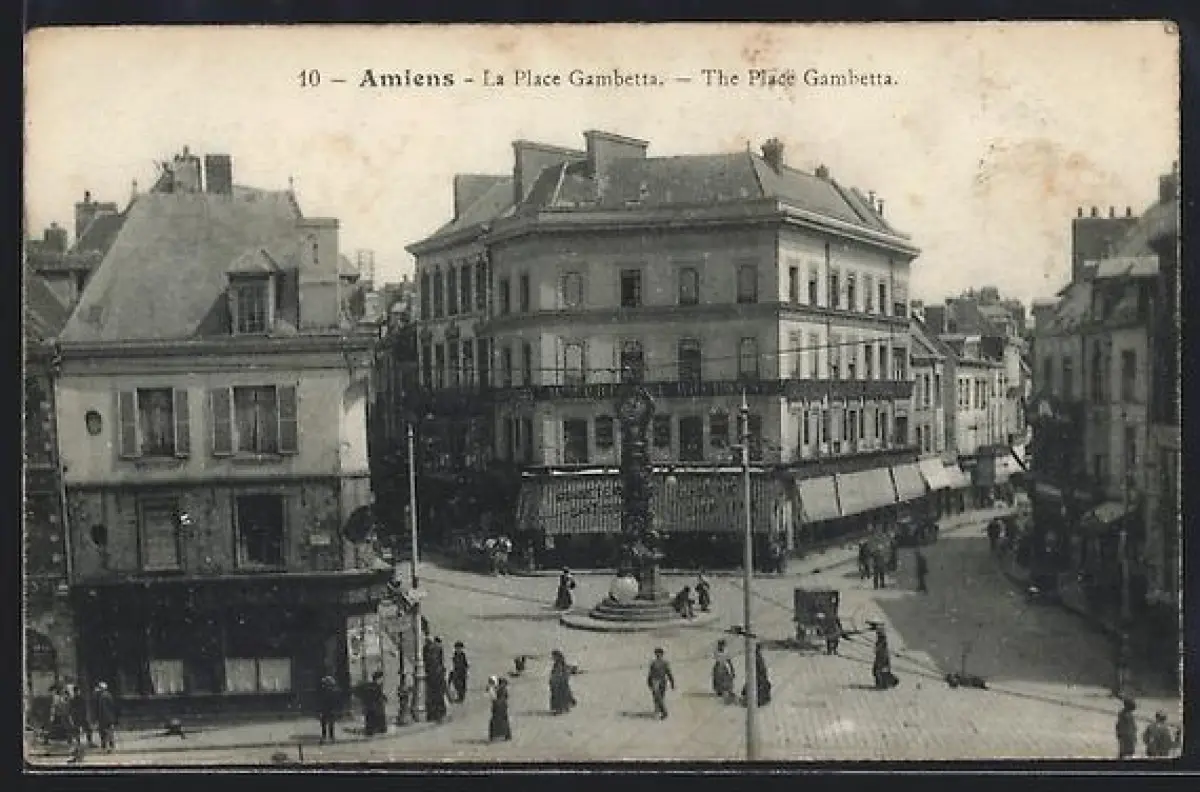 AK Amiens, La Place Gambetta avec passants et bâtiments environnants