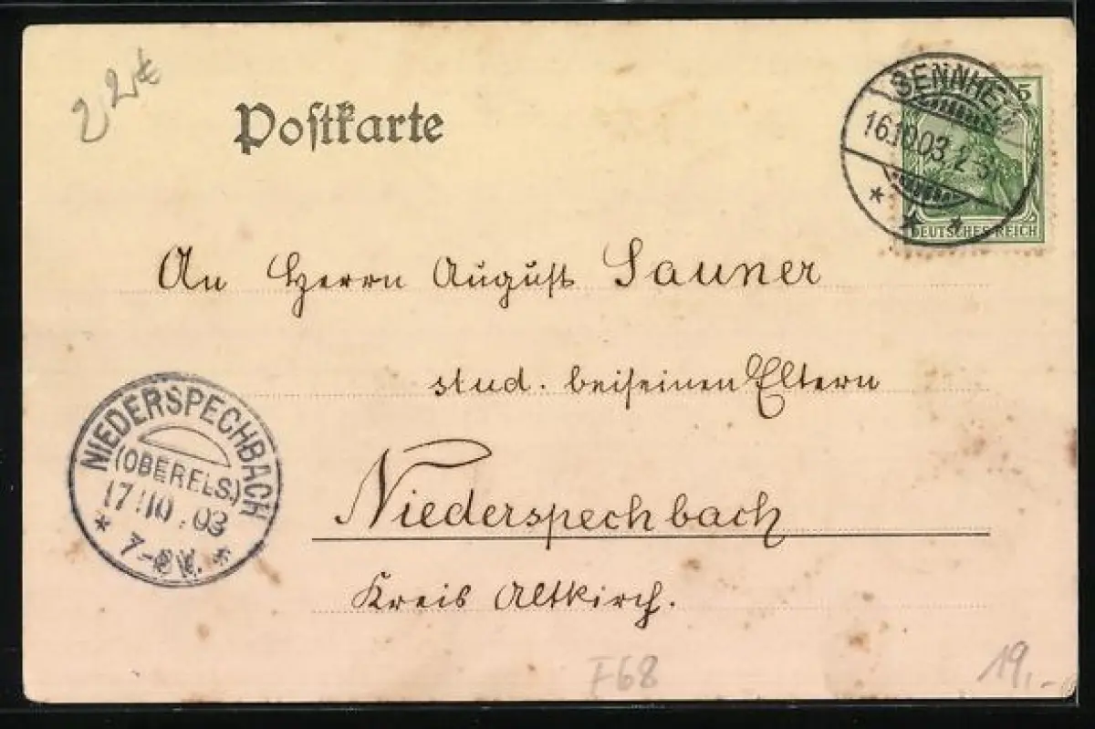 gelaufen 1903, Einriss links unten, Eckknick rechts oben, sonst guter Zustand