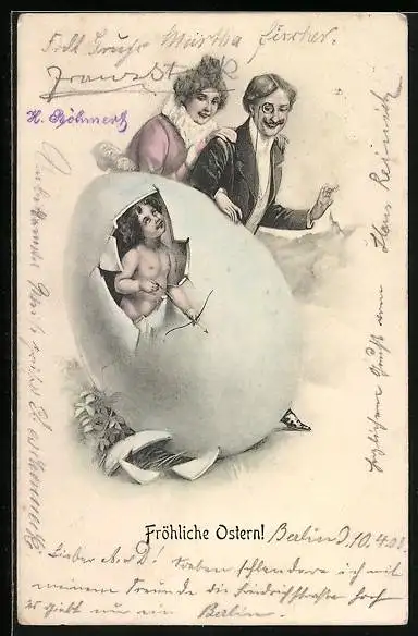 AK Amor schlüpft aus einem Osteri und sieht zu zwei Menschen auf, Fröhliche Ostern