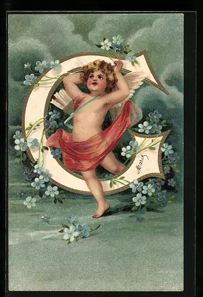 AK Amor tanzt mit Vergissmeinnicht um den Buchstaben C