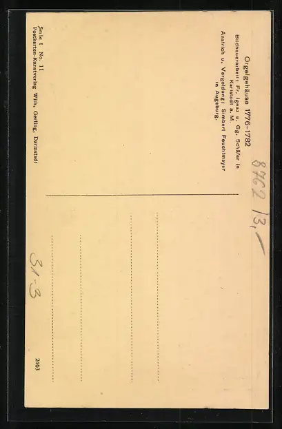 Personenbezogene Daten auf der Rückseite der Karte wurden durch blauen Textmarker unkenntlich gemacht. Die blauen Stellen sind auf die Vorderseite durchgeweicht und wirken sich negativ auf das Postkartenfoto aus