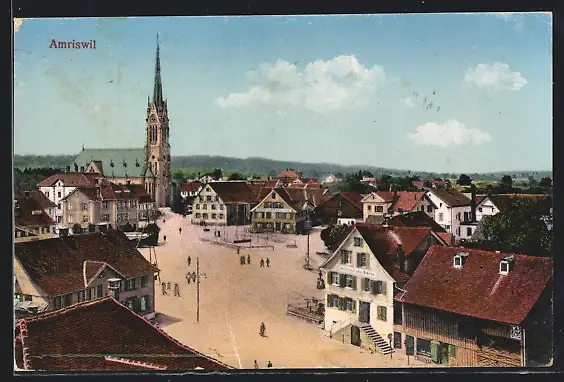 AK Amriswil, Kirche und Geschäfte am Marktplatz