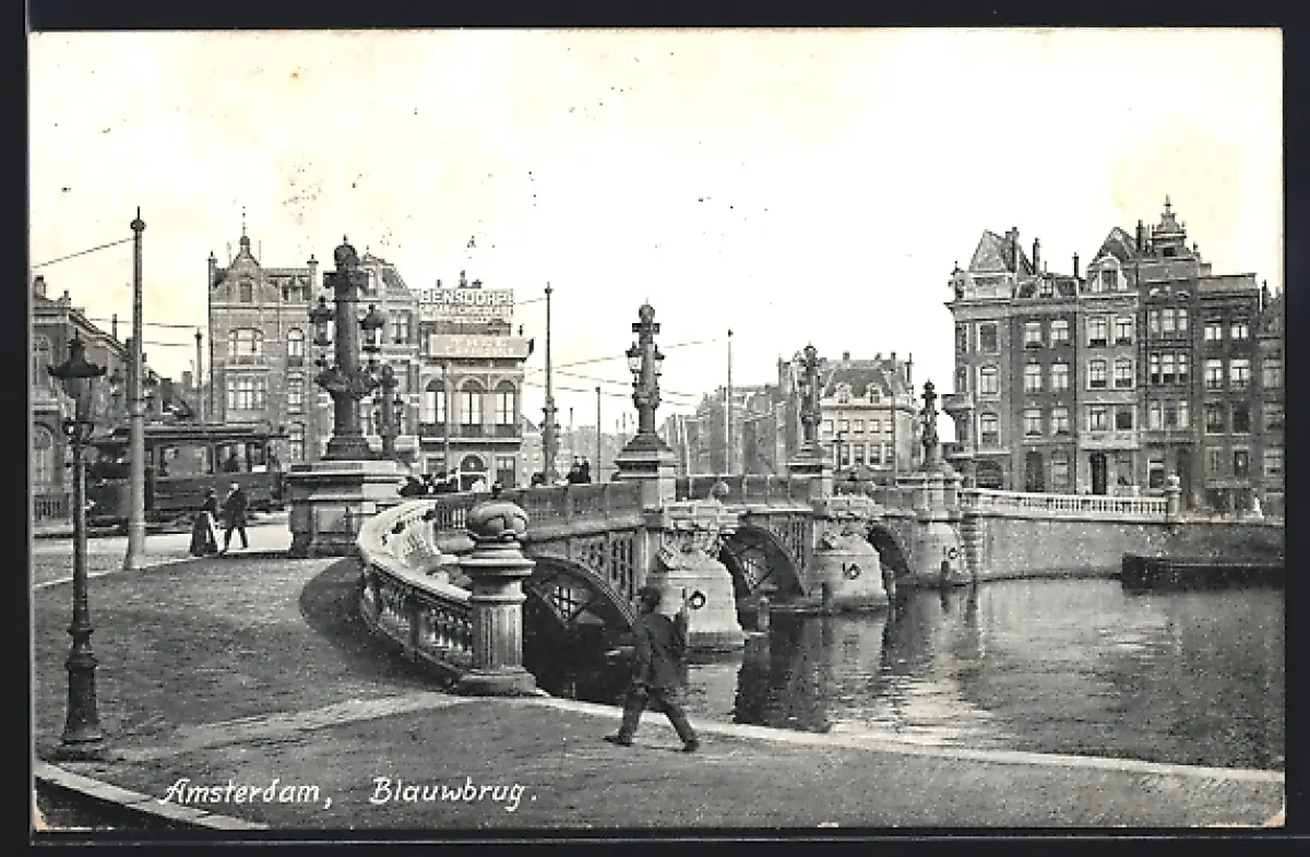 AK Amsterdam, Blauwbrug, Strassenbahn