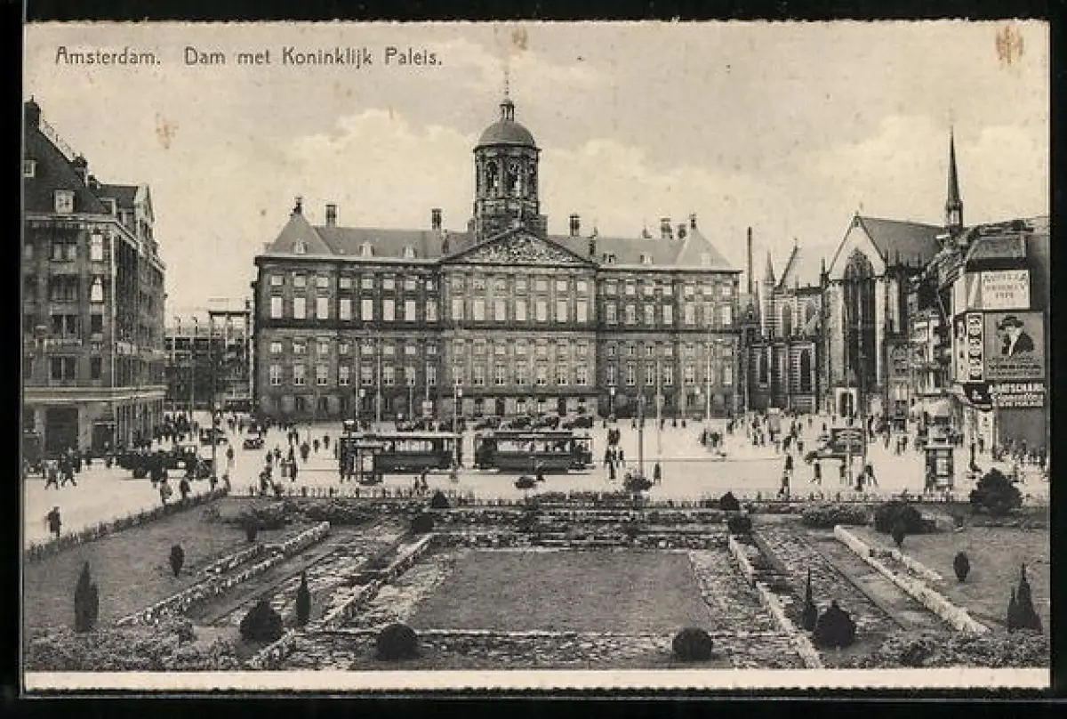 AK Amsterdam, Dam met Koninklijk Paleis, Strassenbahn
