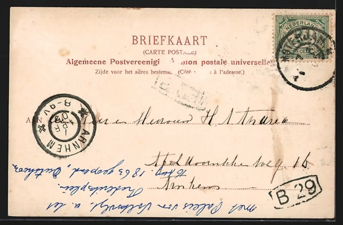 Personenbezogene Daten auf der Rückseite der Karte wurden durch blauen Textmarker unkenntlich gemacht. Die blauen Stellen sind auf die Vorderseite durchgeweicht und wirken sich negativ auf das Postkartenfoto aus