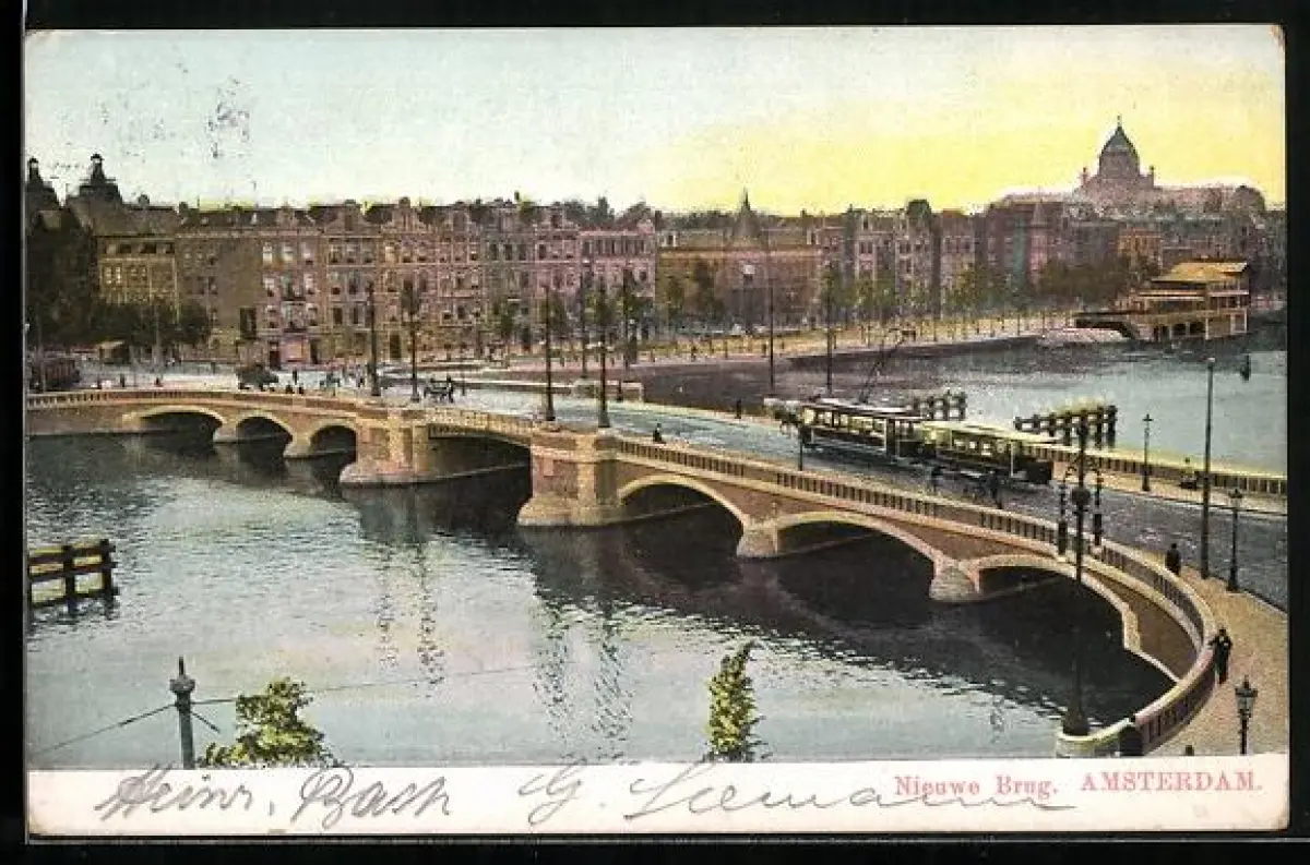 AK Amsterdam, Nieuwe Brug, Brückenpartie mit Strassenbahn