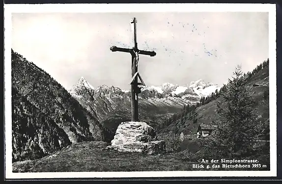 AK An der Simplonstrasse, Blick gegen das Bietschhorn mit Gipfelkreuz