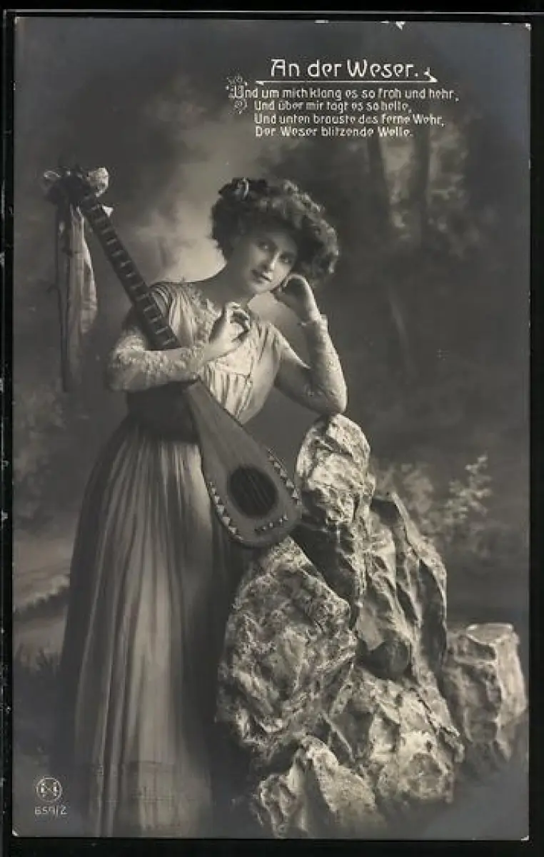 AK An der Weser, Und um mich klang es so froh und hehr..., Junge Frau mit Lautengitarre