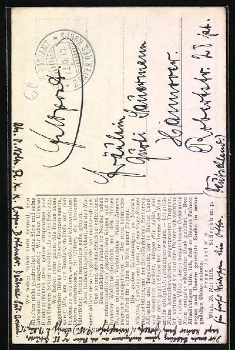 AK An meine Völker, Kaiser Franz Josef I. von Österreich beim Gebet, Karte zur Kriegserklärung Italiens