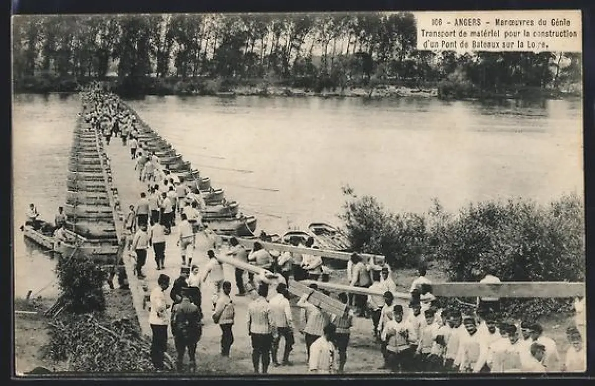 AK Angers, Manoeuvres du Génie: Transport de matériel pour la construction d`un Pont de Bateaux sur la Loire