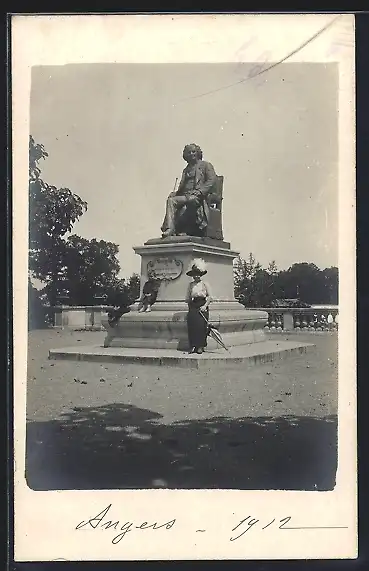 AK Angers, Statue d`un homme assis dans un parc avec visiteurs