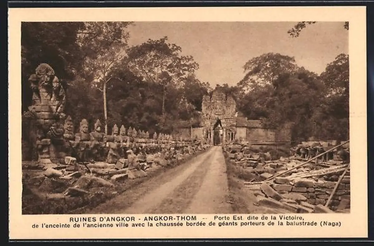AK Angkor-Thom, Ruines d`Angkor, Porte Est dite de la Victore de l`enceinte de l`ancienne ville avec la chaussée