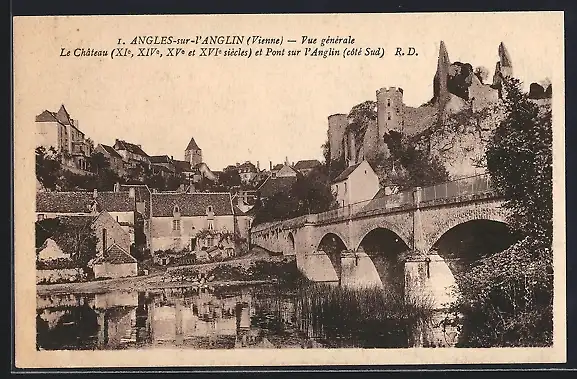 AK Angles-sur-l`Anglin, Vue générale du château, XIe-XVIe siècles, et pont sur l`Anglin, côté Sud