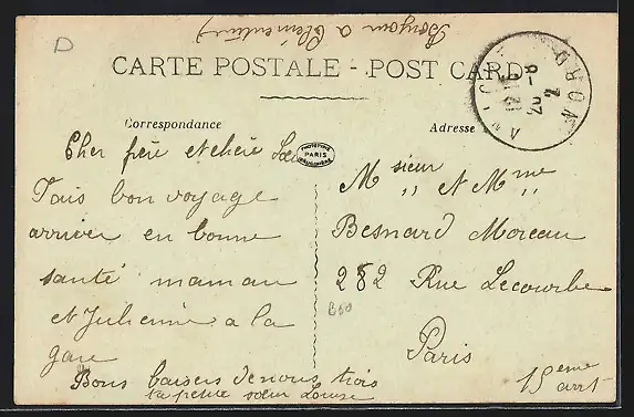 Personenbezogene Daten auf der Rückseite der Karte wurden durch blauen Textmarker unkenntlich gemacht. Die blauen Stellen sind auf die Vorderseite durchgeweicht und wirken sich negativ auf das Postkartenfoto aus