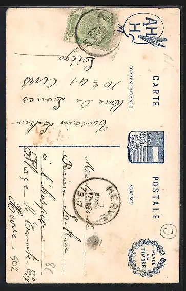 Personenbezogene Daten auf der Rückseite der Karte wurden durch blauen Textmarker unkenntlich gemacht. Die blauen Stellen sind auf die Vorderseite durchgeweicht und wirken sich negativ auf das Postkartenfoto aus