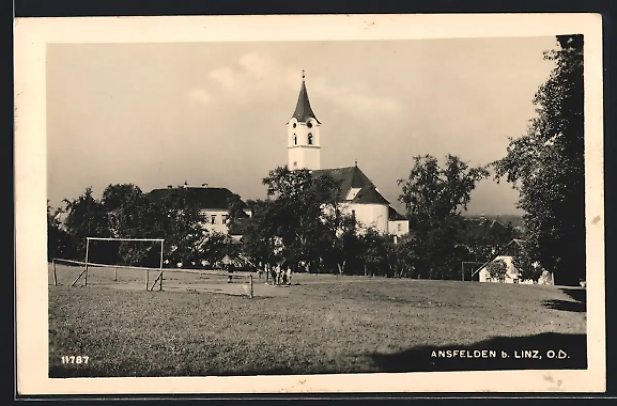 AK Ansfelden bei Linz, Teilansicht mit Kirche, im Vordergrund Fussballplatz