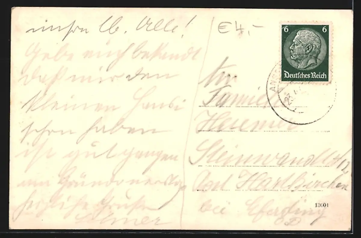 Personenbezogene Daten auf der Rückseite der Karte wurden durch blauen Textmarker unkenntlich gemacht. Die blauen Stellen sind auf die Vorderseite durchgeweicht und wirken sich negativ auf das Postkartenfoto aus