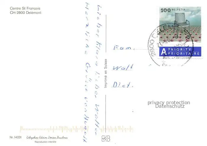 alte Postkarte 14018122 DELEMONT Delsberg JU Centre St Francois Vue aerienne postalisch gelaufen Erhaltung siehe scans [WerneD78]