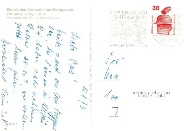 73800927 Fuessen_Forggensee Bootshafen Restaurant am Forggensee Gastraeume Terrasse Teilansichten postalisch gelaufen 1973 Erhaltung siehe scans [WerneD78] [WernPID7 ]