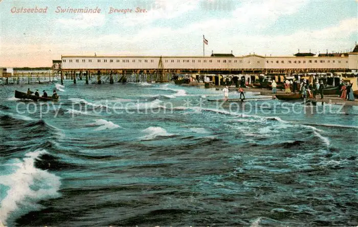 73818102 Swinemuende_Swinoujscie Bewegte See Strand Seebruecke Swinemuende Swinoujscie postalisch nicht gelaufen 1914 Erhaltung siehe scans [FriedD77] [Frierer ]