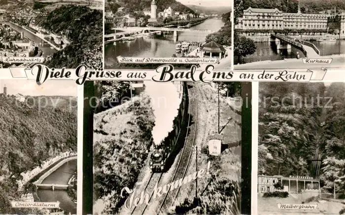 AK / Ansichtskarte 73834977 Bad_Ems_Lahn Lahnabwaerts Roemerquelle und Quellenturm Kurhaus Concordiaturm Dampflok Maibergbahn Bad_Ems_Lahn