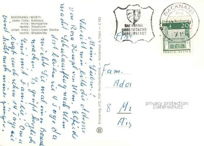 73835545 Backnang Rathaus Murrpartie Stadtturm Telefunken Werke Stadtmitte Backnang postalisch gelaufen nach 1965 Erhaltung siehe scans [WerneD78] [WernPID7 ]