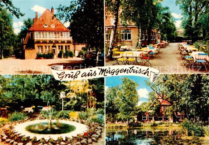 AK / Ansichtskarte 73846574 Mueggenbusch Cafe und Pension Terrasse Brunnen Teich Mueggenbusch