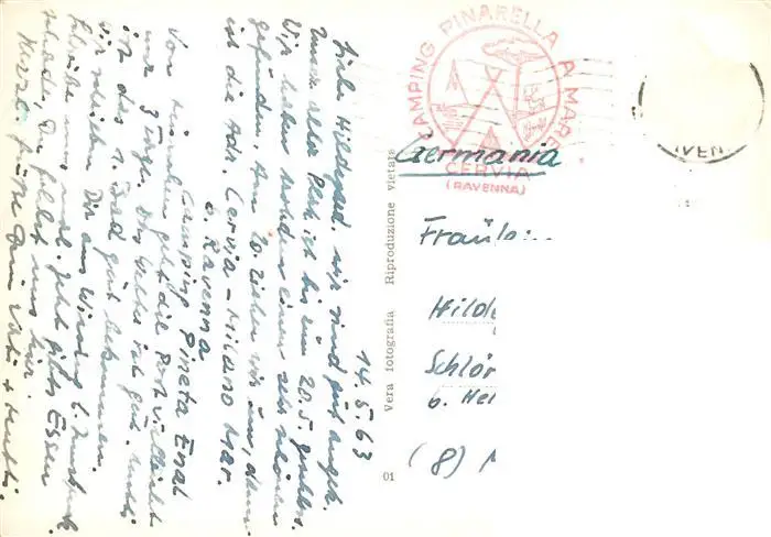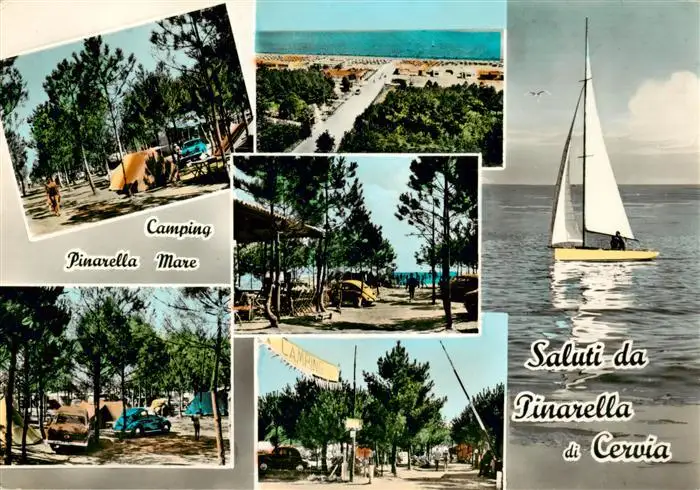 73880603 Pinarella_di_Cervia_IT Camping Pinarella Mare Strandpartien Segelboot postalisch gelaufen 1963 Erhaltung siehe scans [WerneD78] [WernPID7 ]