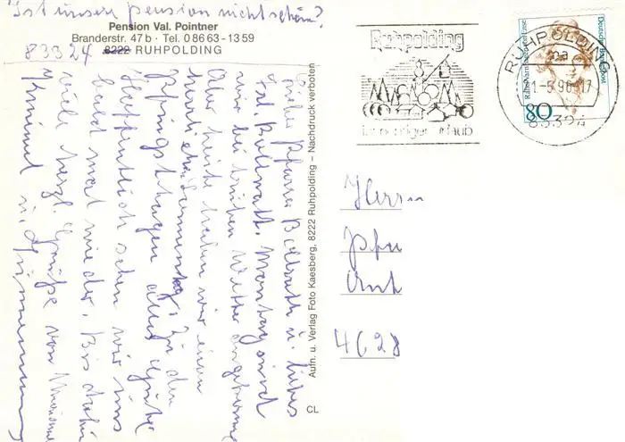 73958715 Ruhpolding Pension Val Pointer postalisch gelaufen 1990 Erhaltung siehe scans [WerneD78] [WernPID7 ]