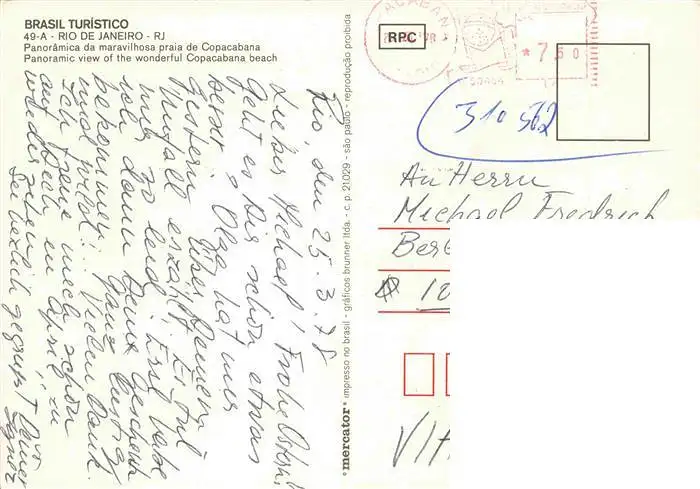 73964653 Rio_de_Janeiro_Brazil Panoramic view of the Copacabana beach postalisch gelaufen 1978 Fliegeraufnahme Erhaltung siehe scans [FriedD77] Fliegeraufnahme[Frierer ]