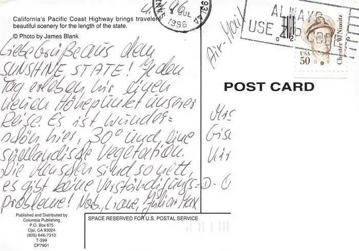 73969404 California_US-State Pacific Coast Highway aerial view postalisch gelaufen 1996 Fliegeraufnahme Erhaltung siehe scans [FriedD77] Fliegeraufnahme[Frierer ]