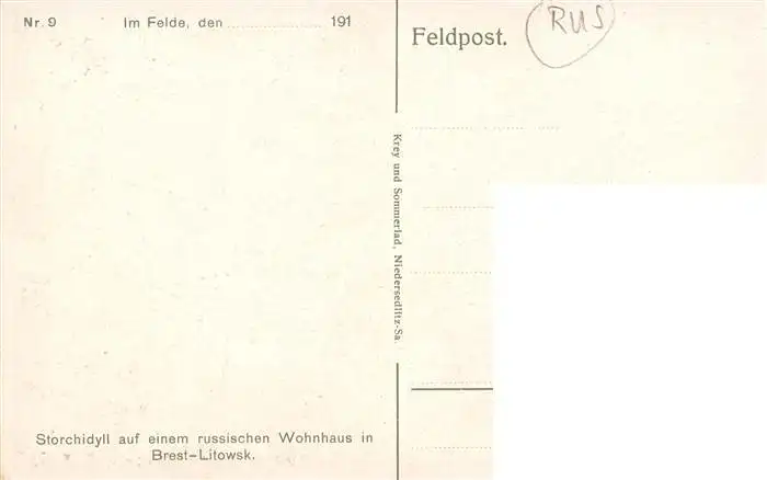 73970845 Brest_-Litowsk_Belarus_Weissrussland Storchidyll auf einem russischen Wohnhaus Feldpost postalisch nicht gelaufen bis 1920 Erhaltung siehe scans [FriedD77] [Frierer ]