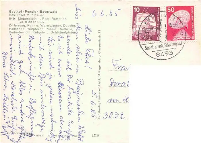73980836 Bad_Liebenstein Gasthof Pension Bayerwald Reitergruppe Pferdekutsche Gastraum postalisch gelaufen 1985 Erhaltung siehe scans [WerneD78] [WernPID7 ]