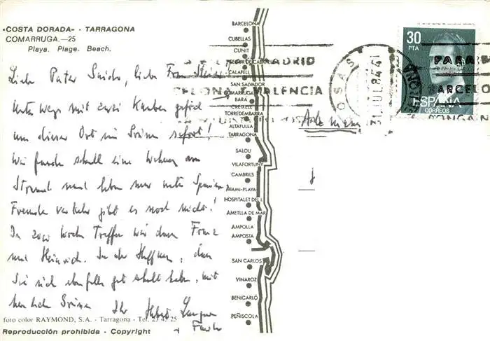 73982076 Comarruga_Vendrell_Costa_Dorada_ES Kuestenpanorama Strand postalisch gelaufen 1984 Fliegeraufnahme Erhaltung siehe scans [FriedD77] Fliegeraufnahme[Frierer ]
