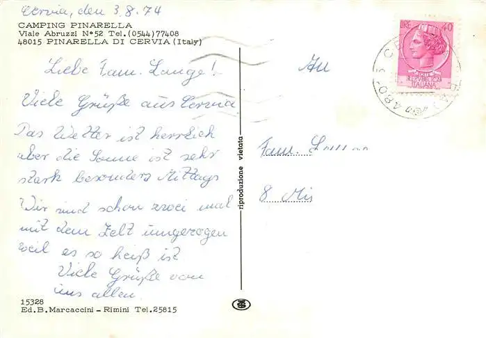 73989126 Pinarella_di_Cervia_IT Camping Pinarella Strand postalisch gelaufen 1974 Erhaltung siehe scans [WerneD78] [WernPID7 ]
