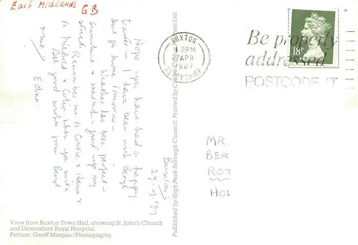 73996206 Devonshire View from Buxton Town Hall showing St Johns Church and Devonshire Royal Hospital postalisch gelaufen 1987 Erhaltung siehe scans [WerneD78] [WernPID7 ]