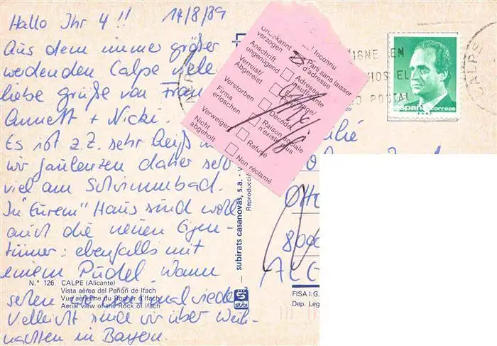 73997469 Calpe_Calp_Alicante_ES Vista aerea del Penon de Ifach postalisch gelaufen 1989 Erhaltung siehe scans [WerneD78] [WernPID7 ]