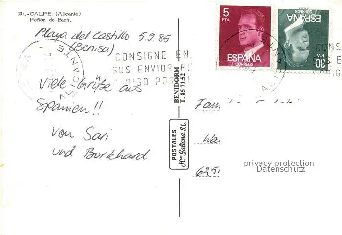74003482 Calpe_Calp_Alicante_ES Penon de Ifach postalisch gelaufen 1985 Erhaltung siehe scans [WerneD78] [WernPID7 ]