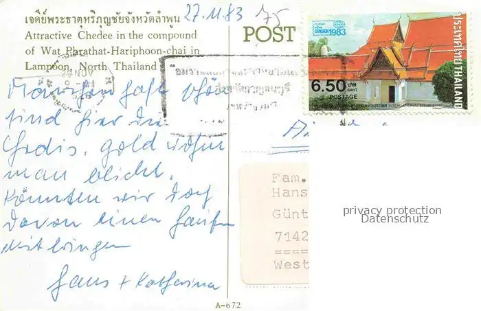 74003941 Lampoon_Thailand Attractive Chedee in the compound of Wat Phrathat-Hariphoon-chai postalisch gelaufen 1983 Erhaltung siehe scans [FriedD77] [Frierer ]