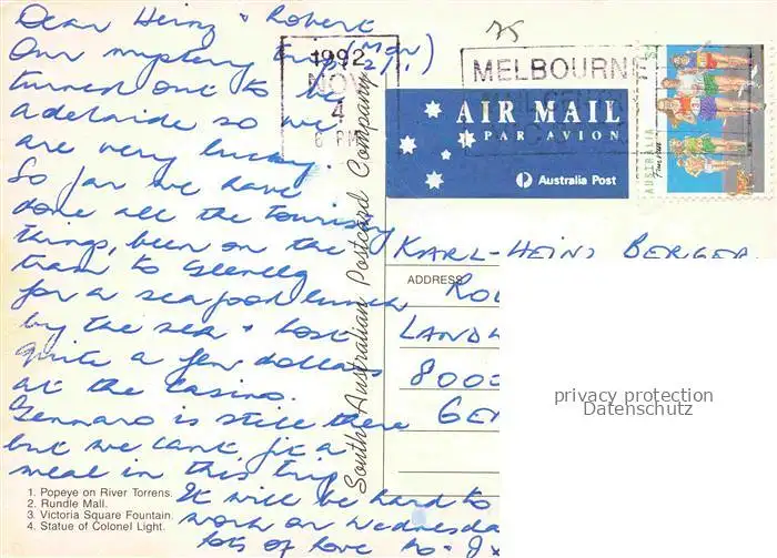 74004392 Adelaide_Australia Popeye on River Torrens Rundle Mall Victoria Square Fountain Statie of Colonel Light postalisch gelaufen 1992 Erhaltung siehe scans [FriedD77] [Frierer ]