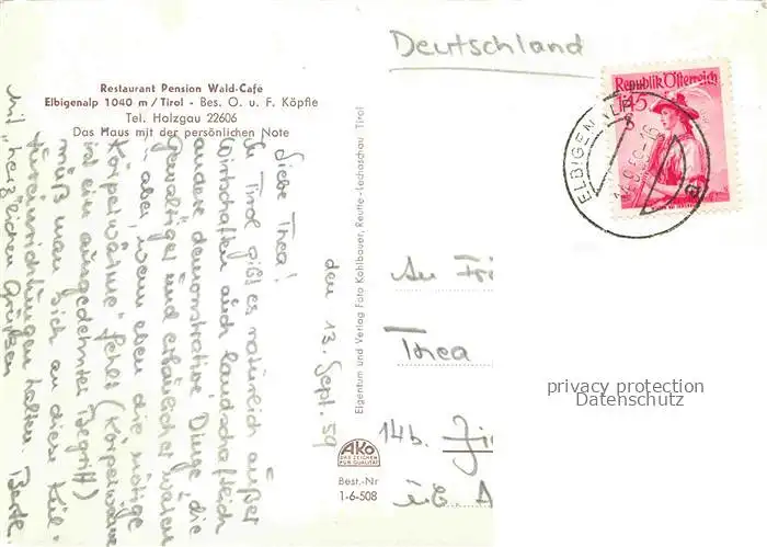 74004902 Elbigenalp_Lechtal_Tirol_AT Restaurant Wald-Café postalisch gelaufen 1959 Erhaltung siehe scans [FriedD77] [Frierer ]