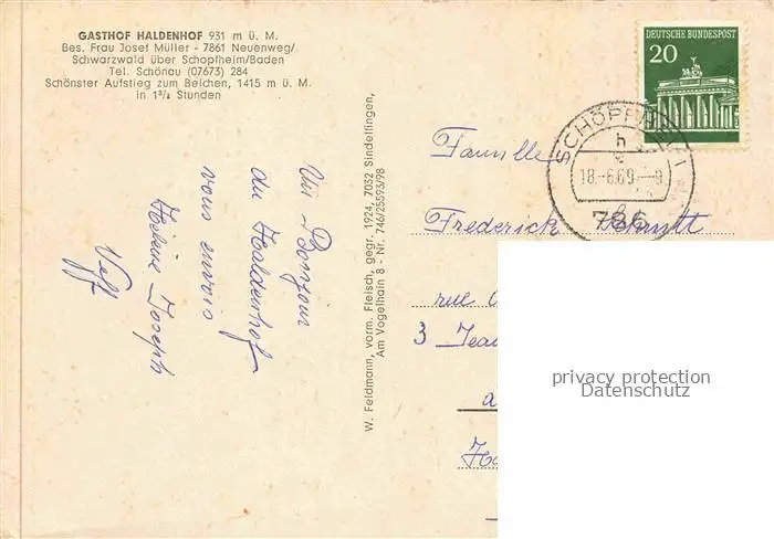 alte Postkarte 74012645 Neuenweg Gasthof Haldenhof Strohmeyer's Gedaechtniskapelle Nonnenmattweiher Blick zum Belchen Schwarzwald postalisch gelaufen Erhaltung siehe scans [FriedD77]