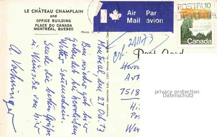 old postcard 74018320 MONTREAL QUEBEC Canada Le Château Champlain and Office Building postalisch gelaufen Erhaltung siehe scans [FriedD77]