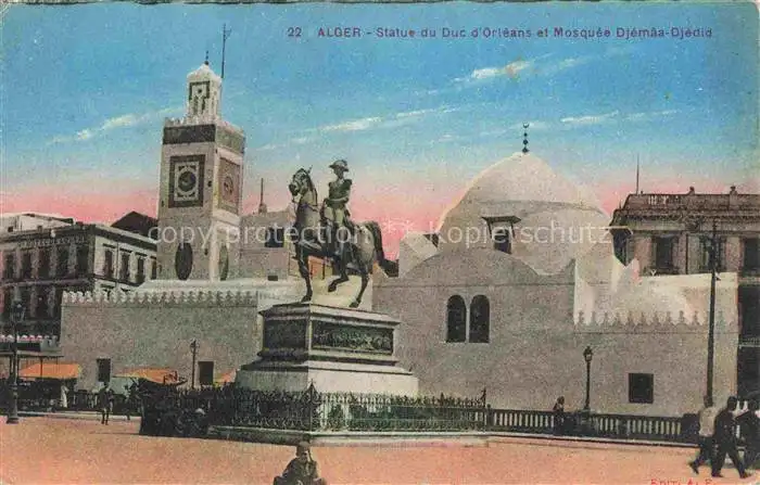 AK / Ansichtskarte 74027698 ALGER Algerie Statue du Duc d'Orléans et Mosquée Djémáa-Djédid