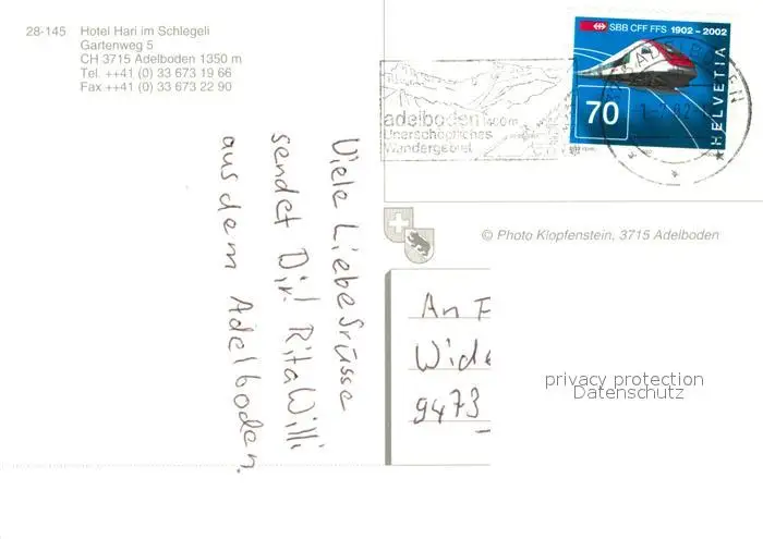 Adelboden Hotel Hari im Schlegeli Adelboden postalisch gelaufen 2002 Erhaltung siehe scans [WerneD78] WernPID7