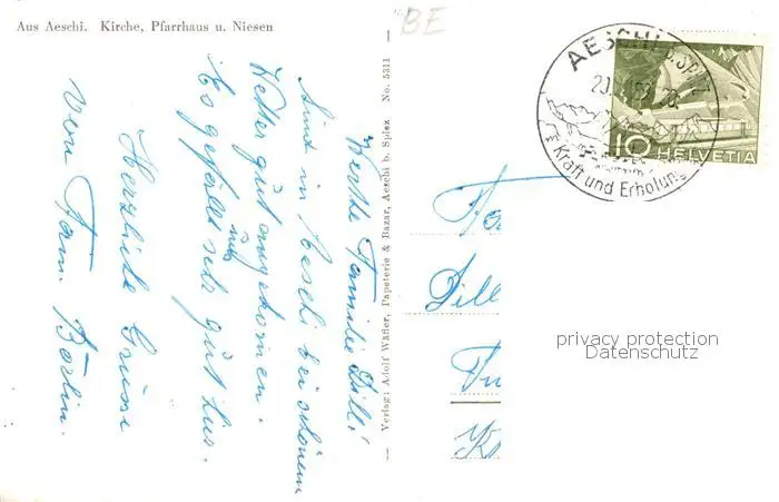 Aeschi_BE Kirche Pfarrhaus und Niesen Aeschi_BE postalisch gelaufen 1921-1965 Erhaltung siehe scans [WerneD78] WernPID7