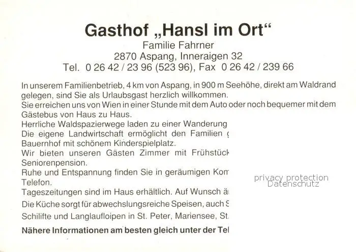 Aspang-Markt Gasthof Hansl im Ort Maedchen mit Hund Kapelle Aspang-Markt postalisch nicht gelaufen nach 1965 Werbekarte (keine Postkarte) Erhaltung siehe scans [FriedD77] Werbekarte (keine Postkarte) Frierer