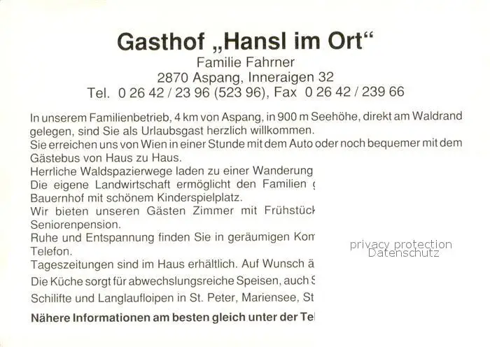 Aspang-Markt Gasthof Hansl im Ort Maedchen mit Rehkitz Kapelle Aspang-Markt postalisch nicht gelaufen nach 1965 Werbekarte (keine Postkarte) Erhaltung siehe scans [FriedD77] Werbekarte (keine Postkarte) Frierer