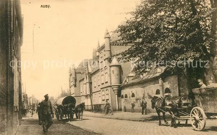 Auby_Nord Strassenpartie Pferdefuhrwerke Auby_Nord postalisch gelaufen 1918 Feldpost Erhaltung siehe scans [FriedD77] Feldpost Frierer