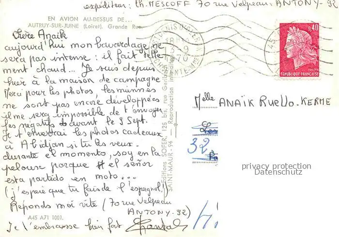 Autruy-sur-Juine Grande Rue vue aérienne Autruy-sur-Juine postalisch gelaufen 1970 Fliegeraufnahme Erhaltung siehe scans [FriedD77] Fliegeraufnahme Frierer